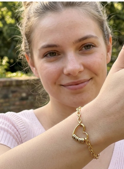 Our Claire Interlocking Adjustable Hearts Bracelet with 18K Gold Plating puts your love on display. Perfect for mom, grandma, or your significant other, this exquisite piece showcases two interlocked hearts, each with a customized inscription in our traditional printed font. An extender makes it easy to find the perfect fit. This bracelet is made with 18k Gold Plated Sterling Silver. It features: